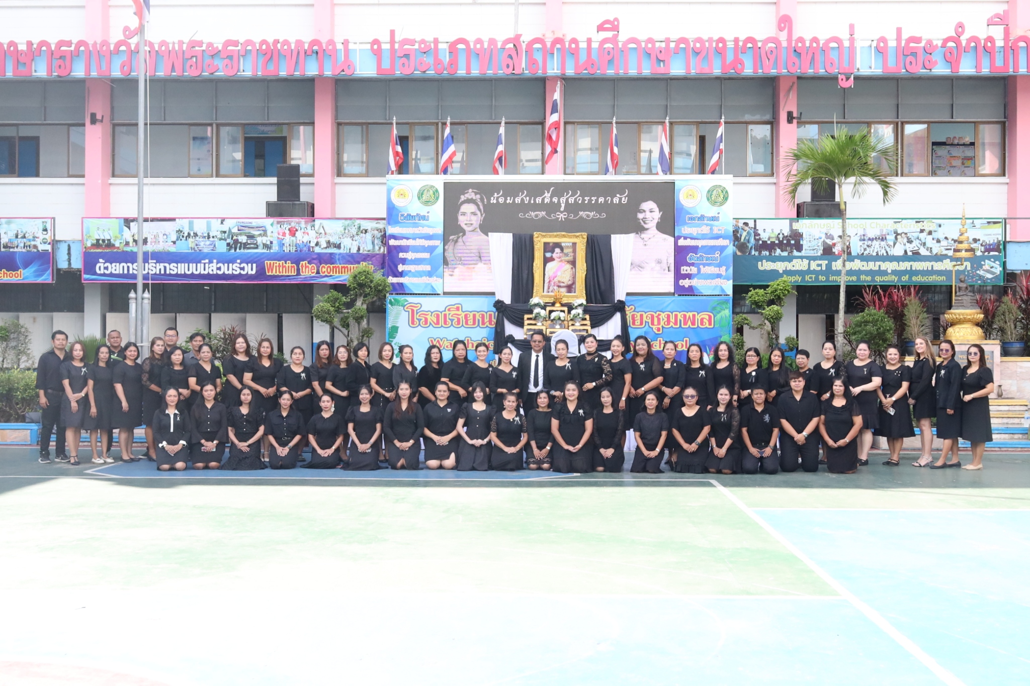 วันพฤหัสบดี ที่6 พฤศจิกายน 2568 นายการุญ ปัญจะสุวรรณ์ ผุ้อำนวยการสถานศึกษาโรงเรียนเทศบาลวัดชัยชุมพล นำคณะผู้บริหาร ตัวแทนคณะกรรมการสถานศึกษาขั้นพื้นฐาน คณะกรรมการเครือข่ายผู้ปกครอง ผู้นำชุมชน ศิษย์เก่า คณะครู บุคลากรและนักเรียนโรงเรียนเทศบาลวัดชัยชุมพล ร่วมพิธีถวายความอาลัย สมเด็จพระนางเจ้าสิริกิตติ์ พระบรมราชินีนาถ พระบรมราชชนนี พันปีหลวง ด้วยการลงนามถวายความอาลัย ยืนสงบนิ่งรำลึกในพระมหากรุณาธิคุณอย่างหาที่สุดมิได้ เป็นเวลา 93 วินาที และน้อมส่งเสด็จสู่สวรรคาลัยด้วยการแปรอัษร “ท.1 วัดชัยชุมพล” เหล่าข้าพระพุทธเจ้า ร่วมส่งดวงใจแห่งความจงรักภักดี พระบารมีของพระองค์จะสถิตในใจเหล่าพสกนิกรชัยชุมพลตราบนิจนิรันดร์