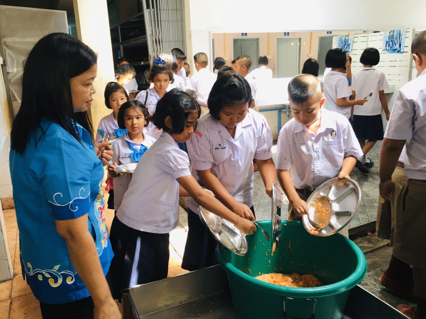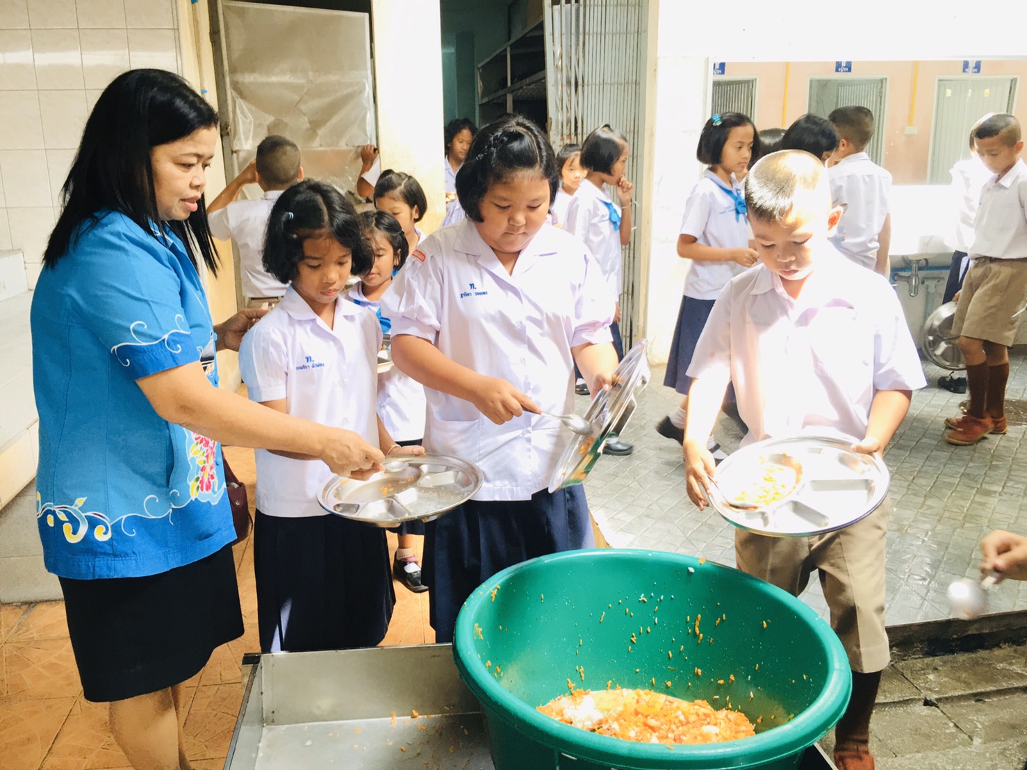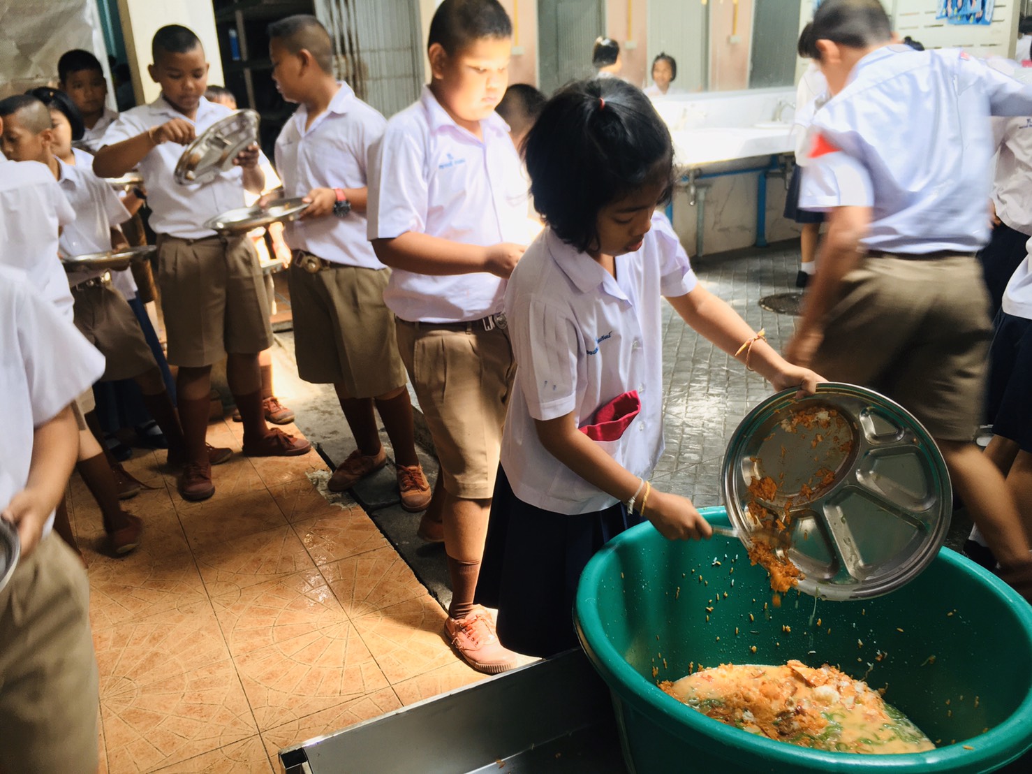 ช่วงเวลาพักเที่ยงของทุกวันๆ ครูเวรประจำวัน ควบคุมดูแลการคัดแยกเศษอาหารของนักเรียน
