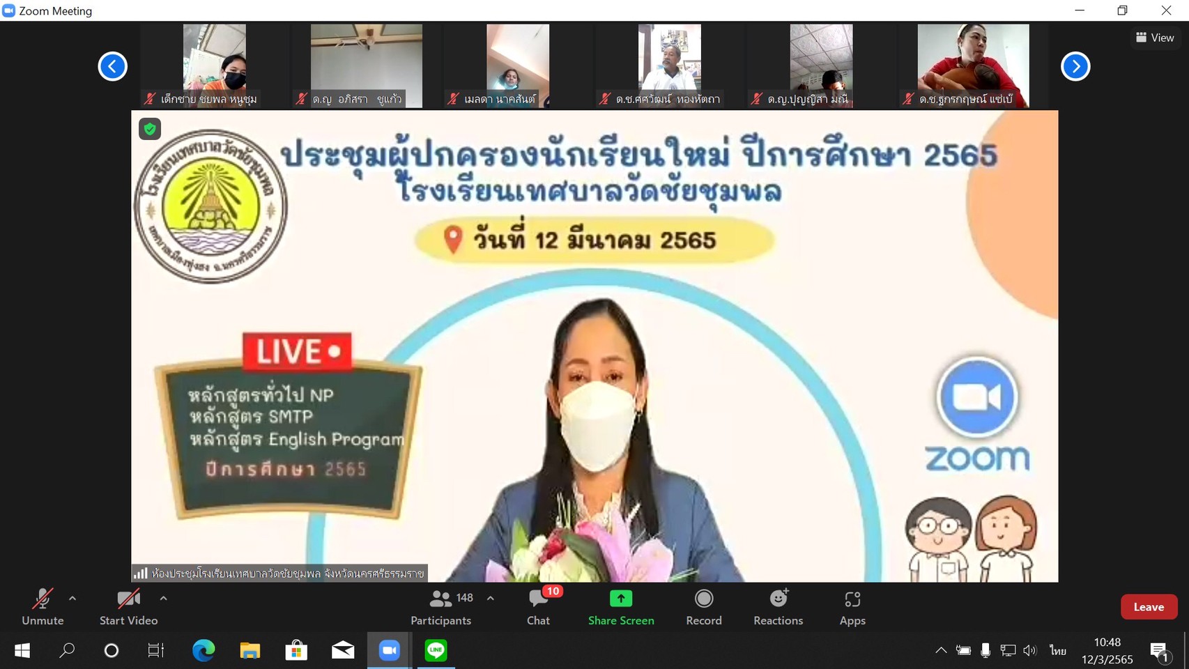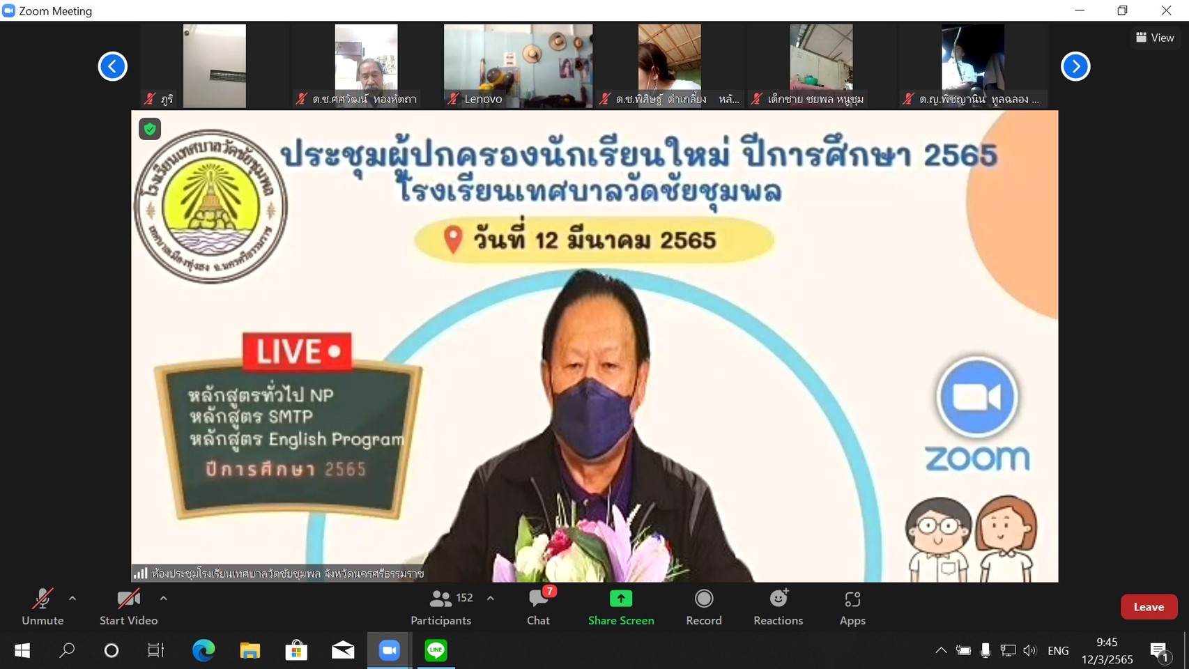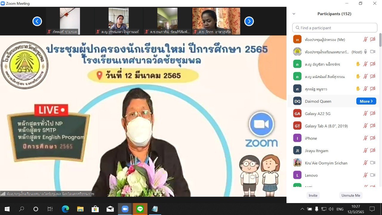 เมื่อวันที่ 12 มีนาคม พ.ศ.2565 โรงเรียนเทศบาลวัดชัยชุมพล จัดประชุมผู้ปกครองนักเรียนใหม่ออนไลน์ ระดับชั้น ป.1 และ SMTP ปีการศึกษา 2565 ผ่านระบบ ZOOM โดยมีนายทรงชัย วงษ์วัชรดำรง นายกเทศมนตรีเมืองทุ่งสง นายศุภศักดิ์ รักเล่ง ผู้อำนวยการกองศึกษา คณะผู้บริหารสถานศึกษา นำโดยนายการุญ ปัญจะสุวรรณ์ และคณะกรรมการสถานศึกษาโรงเรียนเทศบาลวัดชัยชุมพล มาพูดคุยและพบปะกับผู้ปกครอง