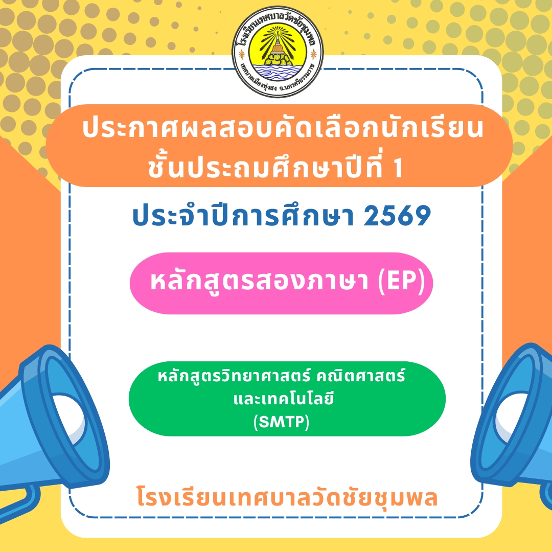 ประกาศผลสอบคัดเลือกนักเรียน ป.1 ปีการศึกษา 2569 หลักสูตร EP/SMTP